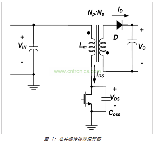 與共振電路在轉(zhuǎn)換過程中發(fā)揮積極作用的共振拓撲不同,準共振拓撲僅實施軟換向過程。圖 1 中顯示準共振返馳式轉(zhuǎn)換器的簡化圖表。這種拓撲與常規(guī)方波 PWM 返馳式轉(zhuǎn)換器具有明確的相似之處,其中 MOSFET 輸出電容器 (Coss) 表示漏極節(jié)點的總電容。