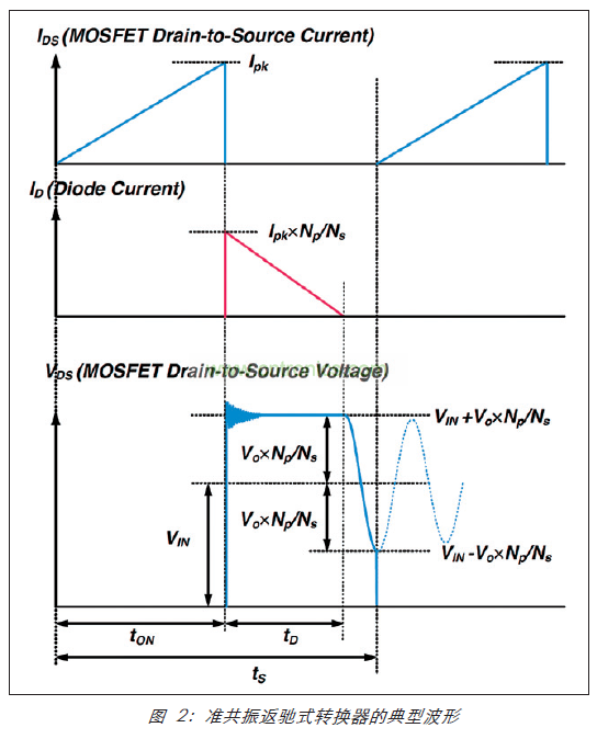 圖 2 顯示準共振返馳式轉(zhuǎn)換器的典型波形。如果二極管電流在 MOSFET 關閉后達到零,則 MOSFET VDS 會由于原邊電感器 (Lm) 與 MOSFET 輸出電容器 Coss 之間的共振而開始振蕩。在 VDS 達到其最小值時(因漏極與源極之間的電容負載,降低 MOSFET 導通開關損耗),通過開啟 MOSFET 來實現(xiàn)準共振交換。設計變壓器匝數(shù)比 Np/Ns,以便共振振幅大于 VIN,從而使零電壓開關 MOSFET 能夠?qū)崿F(xiàn)。