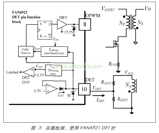 首次進行準共振轉(zhuǎn)換器設計之前,在前面所述的應用說明的幫助下,了解將面臨的主要問題是一件非常值得的事情。正如討論的那樣,可靠檢測 MOSFET 電壓谷值是準共振轉(zhuǎn)換器操作中的要素。某些 PWM 轉(zhuǎn)換器實施此功能要比其他轉(zhuǎn)換器做得更好,因此在評價競爭對手的設備時,務必留意這一點。例如,圖 3 顯示使用 Fairchild FAN6921 PWM 控制器的谷值檢測電路的典型應用。通過監(jiān)視流出谷值檢測針 (DET) 的電流來檢測MOSFET的電壓谷值;當流出檢測針的電流超過30μA 時,將觸發(fā)該電路。這是特別有吸引力的解決方案,因為它只需要一個變壓器輔助線圈和兩個電阻。