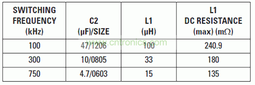 本例中,我們可以通過750-kHz開關頻率來產(chǎn)生一個5-V輸出電壓(參見表2)。但是,如果該頻率為1 MHz,則最低可能輸出電壓被限制為約6V;否則,DC/DC轉(zhuǎn)換器會跳過脈沖。替代方法是降低輸入電壓或者頻率。在選擇某個開關頻率以前,你最好是先查看DC/DC轉(zhuǎn)換器數(shù)據(jù)表,了解保證最小可控“導通”時間。