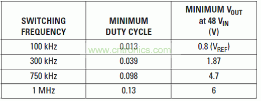 最小可控“導通”時間限制是DC/DC轉(zhuǎn)換器IC的一個特點,其為脈寬調(diào)制(PWM)電路的最窄可達脈寬。在降壓轉(zhuǎn)換器中,開關周期期間功率MOSFET導通的時間百分比被稱作占空比,其等于輸出電壓與輸入電壓的比。使用TPS54160轉(zhuǎn)換器時,占空比為0.104(4 V/48 V),而數(shù)據(jù)表中列出的最小“導通”時間為130 ns??煽孛}寬限制產(chǎn)生一個最小可達占空比,而用最小“導通”時間乘以開關頻率,我們可以輕松地計算出該占空比的大小。一旦知道了最小占空比,利用VIN乘以最小占空比,我們便可以計算出最低可達輸出電壓。最低輸出電壓同樣也受轉(zhuǎn)換器基準電壓的限制,使用TPS54160時其為0.8V。