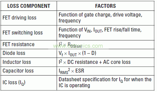 DC/DC轉(zhuǎn)換器的效率,是進行電源設計時需要考慮的最重要屬性之一。低效率會轉(zhuǎn)換成高功耗,必須要在印刷電路板(PCB)上使用單獨的散熱器或者更多的銅,才能處理這些功耗。功耗也對電源上游器件提出了更高的要求。如表3所示,功耗共有幾個組成部分。
