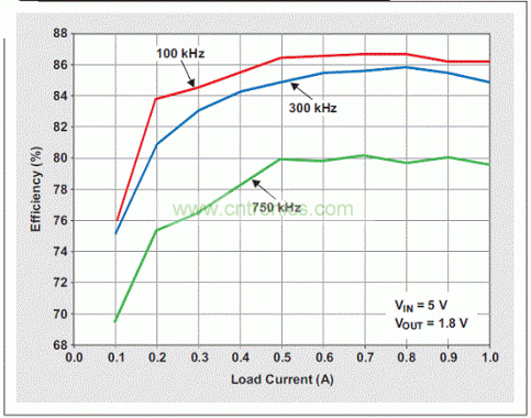 三個例子的重要損耗組成部分,來自于FET驅(qū)動損耗、FET開關損耗和電感損耗。FET電阻和IC損耗是一致的,因為所有三個設計中都使用了相同的IC。由于所有例子中都選擇了低ESR的陶瓷電容,因此電容損耗可以忽略不計。為了表明高頻開關的影響,我們對每個例子的效率都進行了測量,并將其顯示在圖2中。該圖清楚地表明,效率隨開關頻率增加而下降。若想提高所有頻率下的效率,需要尋找到一種全負載狀態(tài)下低漏到源“導通”電阻、低門電荷或者低靜態(tài)電流規(guī)范的DC/DC轉(zhuǎn)換器;或者尋找到一些具有更低等效電阻的電容和電感。