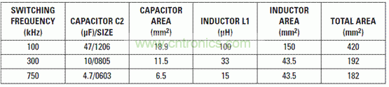 表4列出了三種設計要求的總電路板面積,以及電容和電感的焊盤面積。電容或者電感的建議焊盤面積,稍稍大于單個組件本身,且三種設計舉例均使用了該面積。每個組件占用的面積相加(其包括IC、濾波器以及所有其它小型電阻器和電容的焊盤尺寸),然后將得到的結(jié)果乘以2倍(考慮到組件的間距),便得到總面積。100-kHz和750-kHz設計之間存在近250 mm2的總面積節(jié)省,從而使濾波器體積縮小50%,而板空間占用減少55%。但是,存在收益遞減規(guī)律,因為電容和電感值無法減少至零!換句話說,不斷推高頻率并不能夠一直減小總尺寸,因為你無法總是能夠在市場上買到這些尺寸適合且批量生產(chǎn)的電感和電容。注意,33-µH和15-µH電感占用相同的面積。存在這種可能性,是因為33-µH電感的高度為3.5 mm,而15-µH電感僅高2.4 mm。我們想通過這兩種電感來說明的觀點是:電感與體積成正比例關系。