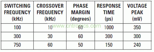 瞬態(tài)響應是電源性能級別的一個較好指標。我們利用每種電源的波特圖來表明高開關頻率的對比情況(參見圖3)。如圖所示,每個電源的相位裕度在45°和55°之間,其表明瞬態(tài)響應得到較好的抑制。交叉頻率約為開關頻率的1/8。使用快速開關DC/DC轉(zhuǎn)換器時,設計人員應確保電源IC誤差放大器具有足夠的帶寬來支持高交叉頻率。TPS54160誤差放大器的單位增益頻寬一般為2.7 MHz。表5顯示了實際瞬態(tài)響應時間以及電壓峰值過沖的相關值。開關頻率越高,過沖值便越是更低,原因是更寬的帶寬。
