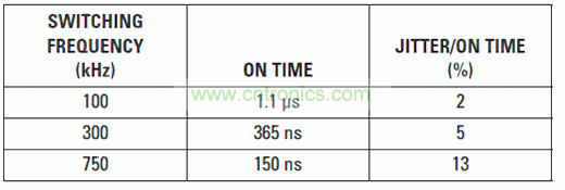 高轉(zhuǎn)換比和更高頻率時,會存在噪聲問題。當選擇某個高開關頻率時,設計人員應考慮抖動和DC/DC轉(zhuǎn)換器的最小“導通”時間。當占空比較小時,抖動噪聲便為開關脈沖的更大百分比。表6顯示了48-V到5-V轉(zhuǎn)換比時,抖動與“導通”時間之比。我們假設,在該相位節(jié)點上存在0.5-V二極管壓降和20-ns抖動。