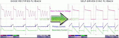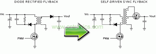 在自驅(qū)動同步反向電源中,輸出二極管被一個 N 通道 MOSFET 代替,同時必須向電源變壓器添加一個繞組以生成同步柵極驅(qū)動信號。相比輸出二極管整流器,該同步MOSFET的低導(dǎo)通電阻可帶來更低的傳導(dǎo)損耗,這就極大地提高了高負載電流時的效率。