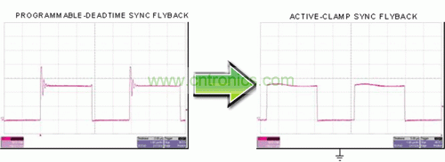 圖 4 描述了如何進一步提高效率并利用同步 MOSFET 柵極驅(qū)動信號來控制一個有源主緩沖器。這種結(jié)構(gòu)通常被稱為有源鉗位反向結(jié)構(gòu)。在前面示意圖中,我們已經(jīng)使用 RCD 緩沖器來降低一次側(cè) MOSFET 漏-源-電壓的電壓峰值。該電壓峰值出現(xiàn)在一次側(cè) MOSFET 關(guān)閉時,這主要是由于變壓器主繞組的泄露能量造成的。RCD 緩沖器消耗了其緩沖器電阻中的這種能量。在有源鉗位反向結(jié)構(gòu)中,泄露能量由鉗位電容捕獲,并被帶至負載再循環(huán),最后返回到輸入。這就構(gòu)成了一個實際上無損耗的緩沖器。RCD 緩沖器的漏-源極-電壓波形和一個有源鉗位的對比關(guān)系如圖 5 所示。該有源鉗位消除了高頻峰值。除消除漏能損耗以外,開關(guān)損耗和 EMI 也得到了極大降低。在許多情況下,這種有源鉗位緩沖器允許使用低漏-源-電壓額定值的一次側(cè) MOSFET,從而進一步降低了損耗,并有可能降低 MOSFET 的成本。
