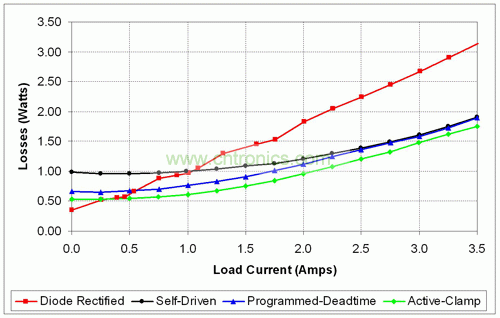 圖 6 顯示了每次二極管整流反向結(jié)構(gòu)升級對實際設(shè)計效率的提升程度。電源將一個遠距通信 48VDC 輸入轉(zhuǎn)換為一個 3.5A 最大負載電流的 3.3V 輸出。將一個二極管整流器轉(zhuǎn)換為一個自驅(qū)動同步反向結(jié)構(gòu)使最大負載效率提高超過 7%,但也確實降低了 1A 以下輸出電流的輕負載效率。這是由于同步 MOSFET 帶來了柵極驅(qū)動損耗、開關(guān)損耗和直通損耗。如圖 7 所示,輕負載狀態(tài)下這些損耗在總損耗中占較大百分比,從而降低了輕負載的效率。使用可編程延遲消除了直通損耗,從而極大地提高了輕負載的效率,如圖 7 所示。由于其他電路損耗在同步 MOSFET 損耗中占主導(dǎo)地位,因此滿負載效率保持基本不變。最終,有源鉗位的實施提高了所有負載條件下 3.3V 電源的效率。