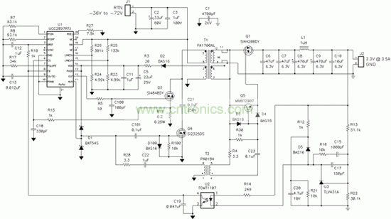 圖 3 顯示了一個具有可編程延遲的隔離柵極驅(qū)動信號如何被添加到同步反向結(jié)構(gòu)中以消除直通損耗。通過柵極驅(qū)動變壓器,可以實現(xiàn)隔離和電平變換。必須使用擁有較好驅(qū)動輸出和可調(diào)節(jié)延遲的 PWM 控制器(例如:UCC2897),以便對一次側(cè)和二次側(cè)同步 MOSFET 進行控制。延遲必須足夠長,以確保同步 MOSFET 能夠在一次側(cè) MOSFET 開啟以前被完全關(guān)閉。然而,延遲太長會引起一個或兩個 MOSFET 上出現(xiàn)主體二極管傳導(dǎo),并導(dǎo)致過多的功率損耗。由于最佳停滯時間取決于一次側(cè)和二次側(cè) MOSFET 延遲時間、轉(zhuǎn)換速度、電源變壓器漏電感以及柵極驅(qū)動電路,因此可調(diào)節(jié)延遲時間控制器對最小化損耗至關(guān)重要。