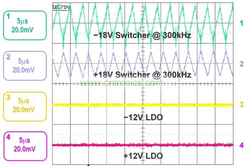 要創(chuàng)建這種參考設(shè)計,需使用一個降-升壓結(jié)構(gòu)的 +60V 開關(guān)轉(zhuǎn)換器來產(chǎn)生一個平衡的+/-輸出電壓。利用低噪聲、高 PSRR LDO(例如:TPS7A30 和 TPS7A49 等),對開關(guān)的正負(fù)電壓輸出進(jìn)行后期穩(wěn)壓。圖 2 中,–18V 軌的開關(guān)穩(wěn)壓器電壓紋波為約 40mV,而 +18V 軌則為 20mV。通過使用 LDO 對 300 kHz 開關(guān)穩(wěn)壓器的輸出進(jìn)行后期穩(wěn)壓,電壓紋波得到極大減弱。這里,我們使用 60V 開關(guān)轉(zhuǎn)換器,因為接地引腳參考至 –18V 軌,并且最大 VIN為 30V。在這種配置中,開關(guān)轉(zhuǎn)換器必須承受的最大電壓為 48V。請為其寬輸入電壓、低輸出噪聲和高 PSRR 選擇 LDO。