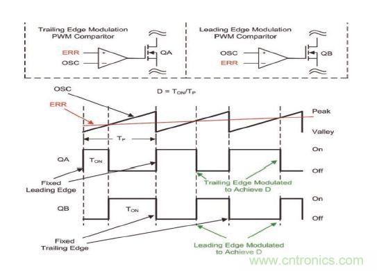 后沿脈寬調(diào)制比較器通過對(duì)比鋸齒電壓波形(OSC)和誤差電壓(ERR)來控制功率轉(zhuǎn)換器占空比(D)。一般,誤差電壓由一個(gè)反饋運(yùn)算放大器控制。在后沿脈寬調(diào)制中,OSC引腳被饋送給脈寬調(diào)制比較器的負(fù)輸入,而誤差電壓則饋送至脈寬調(diào)制比較器的非反相輸入。脈寬調(diào)制比較器的輸出用于控制功率轉(zhuǎn)換器(QA)的FET柵極。該柵極驅(qū)動(dòng)導(dǎo)通信號(hào)與OSC信號(hào)波谷同步。在這種配置結(jié)構(gòu)中,F(xiàn)ET柵極驅(qū)動(dòng)的后沿經(jīng)過調(diào)制,以達(dá)到功率轉(zhuǎn)換器占空比 (D)。該后沿為FET關(guān)斷時(shí)(請(qǐng)參見圖 1)。