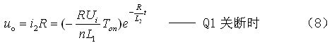 (8)式中,L1、L2分別為開(kāi)關(guān)變壓器初、次級(jí)線圈的電感,n為開(kāi)關(guān)變壓器線圈的匝數(shù)比,n=N2/N1,Ui為變壓器初級(jí)線圈的輸入電壓,Ton為開(kāi)關(guān)管的導(dǎo)通時(shí)間,R為等效負(fù)載電阻。