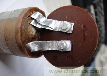 去掉固定的電子膠帶,就可以拆開內(nèi)部的鋁箔卷了。拆開后可以看紙張的材質(zhì)是否均勻,鋁箔是否有明顯的劃痕黑斑等。打開到引線的時候,可以看看刺鉚的是否牢靠,大型的引線可能會有很多對,那是增加輸出電流降低內(nèi)阻用的。大型的電解引條是純鋁條,多半是用超聲波壓接的方式,看不到小孔,但是連接的更牢靠。