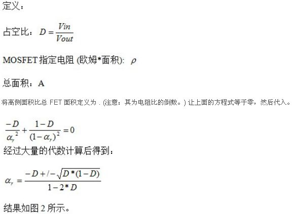 通過(guò)圖1,我們知道50%轉(zhuǎn)換比率時(shí)出現(xiàn)最佳傳導(dǎo)損耗極值。但是,在其他轉(zhuǎn)換比率條件下,可以將損耗降至這一水平以下。附錄給出了進(jìn)行這種優(yōu)化的數(shù)學(xué)計(jì)算方法,而圖2顯示了其計(jì)算結(jié)果。即使在極低的轉(zhuǎn)換比率條件下,F(xiàn)ET芯片面積的很大一部分都應(yīng)該用于高側(cè)FET。高轉(zhuǎn)換比率時(shí)同樣如此;應(yīng)該有很大一部分面積用于低側(cè)。這些結(jié)果是對(duì)這一問(wèn)題的初步研究,其并未包括如高側(cè)和低側(cè)FET之間的各種具體電阻值,開關(guān)速度的影響,或者對(duì)這種芯片面積進(jìn)行封裝相關(guān)的成本和電阻等諸多方面。但是,它為確定FET之間的電阻比提供了一個(gè)良好的開端,并且應(yīng)會(huì)在FET選擇方面實(shí)現(xiàn)更好的整體折中。