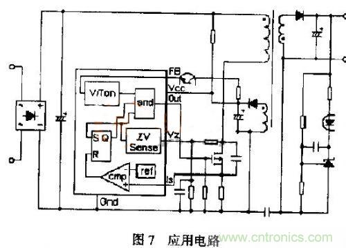 由(9),(10)或可知,調(diào)節(jié)輸出功率、穩(wěn)定輸出電壓可以調(diào)節(jié)導(dǎo)通時(shí)間或占空比或調(diào)頻方式或幾種方式綜合應(yīng)用。當(dāng)輸出功率下降或電源電壓上升,導(dǎo)通時(shí)間減小,反之導(dǎo)通時(shí)間增加;隨輸出功率的增加或減小變壓器初次級(jí)電流峰值均增加或減小,由式(3)可知變壓器的釋放儲(chǔ)能時(shí)間也隨之增加或減少,為實(shí)現(xiàn)“零電壓”開(kāi)關(guān),變壓器不能工作在間歇狀態(tài),因此F%IM控制方式不能滿足本文電路的“零電壓”開(kāi)通的要求?;谏鲜龉ぷ鳁l件的約束,本文電路應(yīng)采用輸出電壓反饋控制導(dǎo)通時(shí)間,用“零電壓”檢測(cè)控制開(kāi)關(guān)管導(dǎo)通時(shí)刻,即調(diào)頻、調(diào)占空比工作方式。具體電路可以采用通用器件組合,如圖7。