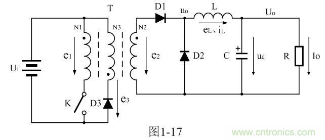 圖1-17是正激式變壓器開關(guān)電源的簡單工作原理圖,圖中,Ui是開關(guān)電源的輸入電壓,T是開關(guān)變壓器,N1、N2、N3分別為開關(guān)變壓器的3個線圈繞組,e1、e2、e3分別為3個線圈繞組產(chǎn)生的感應(yīng)電動勢,K是控制開關(guān),D1是整流二極管,D2是續(xù)流二極管,D3是削反峰整流二極管,L是儲能濾波電感,C是儲能濾波電容,R是負載電阻;uo為整流輸出電壓,或濾波輸入電壓、eL為儲能濾波電感產(chǎn)生的感應(yīng)電動勢、iL為流過儲能濾波電感L的電流、Uo為濾波輸出電壓、Io為流過負載的電流。