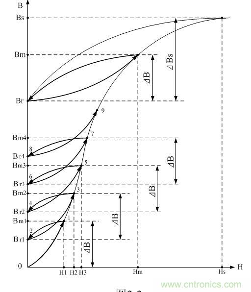 在變壓器鐵芯中,磁感應(yīng)強(qiáng)度B或磁通 受磁場(chǎng)強(qiáng)度H的作用而發(fā)生變化的過(guò)程,稱為磁化過(guò)程;因此,用來(lái)描述磁感應(yīng)強(qiáng)度B與磁場(chǎng)強(qiáng)度H之間對(duì)應(yīng)變化的關(guān)系曲線,人們都把它稱為磁化曲線。圖2-2是單激式開(kāi)關(guān)變壓器鐵芯被磁化時(shí),磁感應(yīng)強(qiáng)度B與磁場(chǎng)強(qiáng)度H之間對(duì)應(yīng)變化的關(guān)系曲線圖。