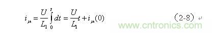 (2-8)式中, 為流過(guò)變壓器初級(jí)線圈的勵(lì)磁電流,U為加到變壓器初級(jí)線圈兩端的電壓,L1為變壓器初級(jí)線圈的電感量,t為時(shí)間, 為初始電流,即t = 0時(shí)刻流過(guò)變壓器初級(jí)線圈的勵(lì)磁電流。
