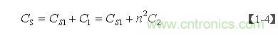 【1-4】式中,Cs為變壓器的總分布電容,Cs1為變壓器初級(jí)線圈的分布電容;而C1為次級(jí)線圈電路中所有電容等效到初級(jí)線圈電路中的電容;C2為次級(jí)線圈電路中所有電容(包括分布電容與電路中的電容);n = N2/N1為變壓比。