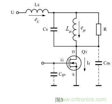 因此,當(dāng)開關(guān)管剛開始導(dǎo)通時(shí),流過開關(guān)管的電流是由小變大,這個(gè)過程,與在電感兩端加一電壓方波時(shí),流過電感的電流由小變大很相似;所以,在開關(guān)管剛導(dǎo)通的一瞬間,開關(guān)管的漏極和源極之間可以等效成一個(gè)電感Lds。由于這個(gè)電感相對(duì)分布電感Ls和勵(lì)磁電感Lu 來說很小,所以圖3中沒有畫出。