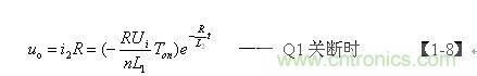 【1-8】式中,L1、L2分別為開關(guān)變壓器初、次級(jí)線圈的電感,n為開關(guān)變壓器線圈的匝數(shù)比,n=N2/N1,Ui為變壓器初級(jí)線圈的輸入電壓,Ton為開關(guān)管的導(dǎo)通時(shí)間,R為等效負(fù)載電阻。