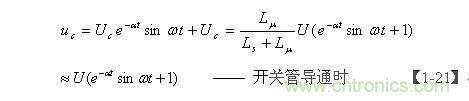 【1-21】式是當(dāng)電源開(kāi)關(guān)管Q1導(dǎo)通時(shí),分布電容Cs兩端電壓隨時(shí)間變化的表達(dá)式,它由兩部分電壓組成,一部分是電容Cs兩端電壓的半波平均值Uc ,由【1-19】式表示;另一部分是正弦阻尼振蕩,其最大振幅等于 Uc, e-at是一個(gè)小于1的衰減系數(shù)。