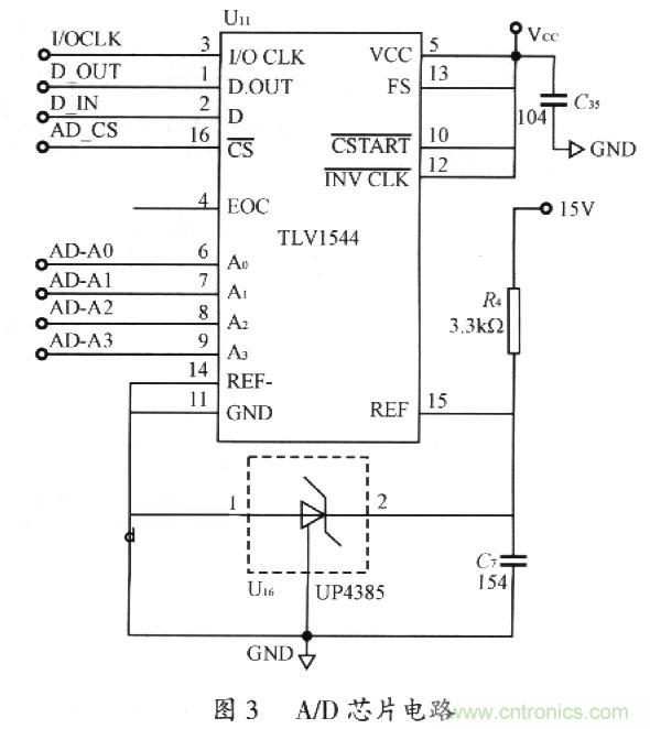 A/D轉(zhuǎn)換芯片采用TLV1544。TLVl544的主要特點(diǎn)是:寬范圍的單電源供電,VCC可為2.7~5.5V;芯片內(nèi)部有著較高的轉(zhuǎn)換速率,轉(zhuǎn)換時(shí)間小于10μs;芯片提供4路外部輸入通道,通過(guò)編程給芯片不同的狀態(tài)字設(shè)置可以任意選擇4個(gè)輸入通道之一;芯片有4個(gè)端口作為同步串行接口,通過(guò)SPI總線(xiàn)的形式與微處理器連接;11位A/D轉(zhuǎn)換,足以滿(mǎn)足系統(tǒng)的要求。如圖3所示。