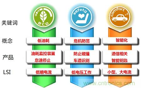 第二個(gè)關(guān)鍵詞是 "信息與舒適" (comfort)。除作為出行工具之外,汽車更多被視為日用品,其智能化也在不斷發(fā)展,例如可以下載并欣賞喜歡的音樂,在路上即可輕松獲得目的地的信息等。而為了實(shí)現(xiàn)這些功能,需要眾多通信相關(guān)的電子元器件。另外,與提高舒適性相關(guān)的電子化也在不斷發(fā)展,無需鑰匙即可開關(guān)車門和啟動(dòng)引擎的智能鑰匙在普通車輛中已基本普及等,使車內(nèi)越來越成為更舒適的空間。