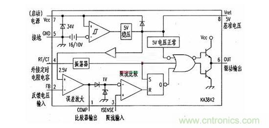 ⑥輸出端驅(qū)動(dòng)能力是±1A。啟動(dòng)電源端,啟動(dòng)電壓低于16V,KA3842不工作