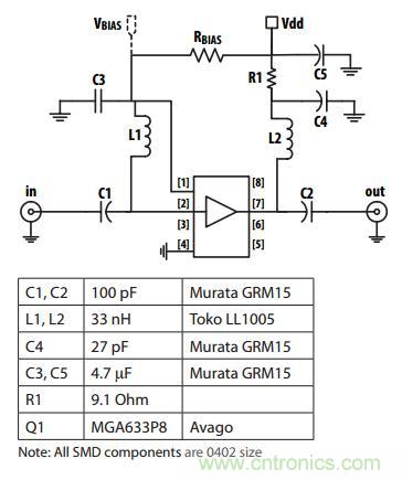 可調(diào)節(jié)的偏壓特性使得工程師在使用器件時(shí)需要在功耗和線性度上做取舍。在不需要高線性度的應(yīng)用中,工程師可以通過增加Rbias(正常為6.8k歐姆)的電 阻來達(dá)到省電的目的?;蛘咴谠鲆婧洼敵龉β首兓淮?ΔG和ΔP1dB≤0.5dB)的情況下,通過改變Idd的電流(25~75mA),使得低噪放的 OIP3產(chǎn)生大約10dB的變化。這使得具有微控制器控制Vbias的低噪放對(duì)頻譜擁擠的自適應(yīng)能力大大增強(qiáng)。