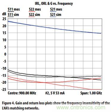 在900MHz,低噪放的噪聲大約為0.3dB,增益大約為18dB,輸入和輸出回波損耗為小于-15dB。另外,在1GHz的帶寬內(nèi),回波損耗都可以滿足 這個(gè)要求。從系統(tǒng)的角度來說,這個(gè)是非常受歡迎的特性。主要是由于傳統(tǒng)的基站需要靠隔離器或者3dB耦合器來滿足系統(tǒng)回波損耗的要求。進(jìn)一步來說,輸入輸 出匹配的寬帶寬也使得基站的雙工器或者輸入輸出濾波器的使用調(diào)試變得簡(jiǎn)單,降低了系統(tǒng)的設(shè)計(jì)復(fù)雜度。