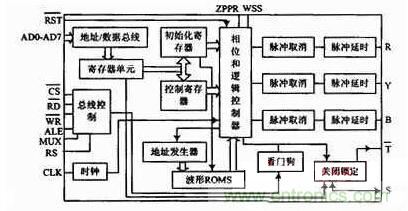 SA4828原理框圖如圖3所示。它接收并存儲微處理器初始化命令和控制命令,主要由總線控制、地址/數(shù)據(jù)總線、存儲器、控制寄存器組成,以控制字的形式實現(xiàn)。三相輸出控制電路的每相輸出控制電路由脈沖取消和脈沖延時電路構成,脈沖取消將脈沖寬度小于取消時間的脈沖去掉,延時電路保證死區(qū)間隔,以防止在轉(zhuǎn)換瞬間橋路開關器件出現(xiàn)直通現(xiàn)象。