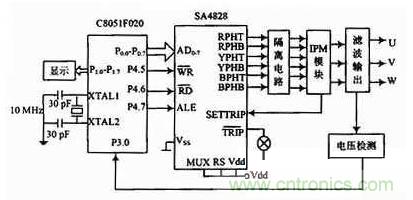 以SA4828與單片機C8051F020為核心構成的控制器電路設計如圖4所示??刂齐娐犯鶕?jù)給定的參數(shù)輸出三相SPWM信號給智能功率模塊IP-M,實現(xiàn)對功率晶體管的通斷控制。C8051F020通過8位P0端口與SA4828的地址、數(shù)據(jù)管腳AD0~AD7相連,工作時,單片機首先對SA4828進行初始化,定義載波頻率,電源頻率范圍、死區(qū)、最小脈沖取消時間等參數(shù)。然后向SA4828的控制寄存器傳送電源的頻率控制字和幅度控制字等參數(shù)。正常工作時,根據(jù)需要對SA4828的控制數(shù)據(jù)進行修改,實現(xiàn)系統(tǒng)的反饋與實時控制,以及調(diào)壓控制。為實現(xiàn)系統(tǒng)的穩(wěn)壓功能,采用平均值反饋PI調(diào)節(jié)。輸出電壓經(jīng)隔離送入C8051F020單片機的A/D轉(zhuǎn)換口即P3.0口,轉(zhuǎn)換結果參與PI運算,運算結果即為SA4828幅度控制寄存器的控制字。從RPHT~BPHB的6個引腳輸出相應頻率和電壓的SPWM控制信號,經(jīng)隔離電路后,分別控制智能功率模塊IPM的6個IGBT的導通與截止,最后在3個輸出端上產(chǎn)生對稱的三相SPWM電壓。SA4828作為單片機的外設,與單片機并聯(lián),通過對單片機編程,只需將SPWM的初始化信息和控制信息寫入SA4828的相關寄存器,即產(chǎn)生精確的全數(shù)字化的三相的SPWM波形。
