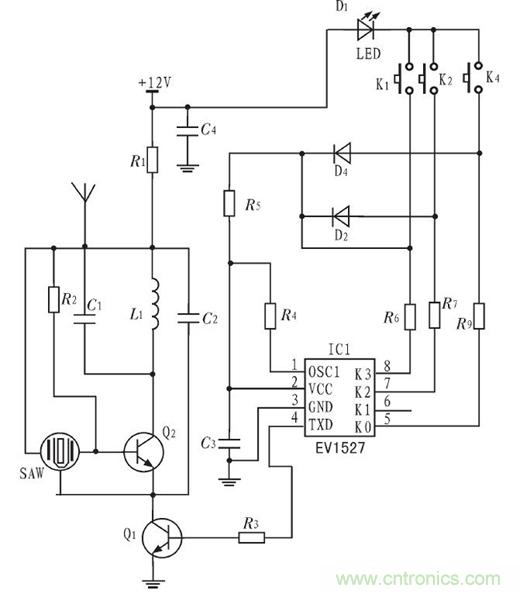 發(fā)送模塊主要由HS1527($1056.0000)無線發(fā)碼芯片、聲表面濾波器、指示燈及濾波電路等組成,發(fā)送模塊作為遙控器來操作,電路圖如圖2所示。當按下不同的按鍵K時,發(fā)碼芯片就會通過天線發(fā)出不同的編碼,編碼經(jīng)過天線發(fā)送到接收模塊由接收模塊將編碼交由控制模塊解析處理,發(fā)送模塊供電電壓12 V,由電池供電。