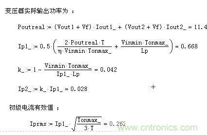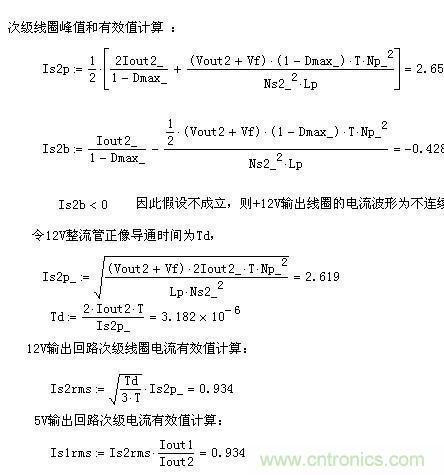 上面是次級電流有效值的計(jì)算,斷續(xù)模式的,并且加入了次級電流連續(xù)或者斷續(xù)的判斷,(判斷這一步其實(shí)沒有必要,因?yàn)樽儔浩鞒跫夁B續(xù),次級也連續(xù),初級斷續(xù),次級也斷續(xù)。)