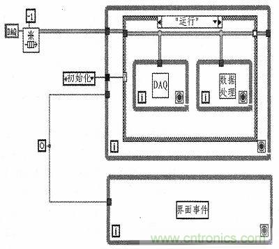 圖4是測試系統(tǒng)軟件的總體架構。其主要要點是:用while循環(huán)實現(xiàn)系統(tǒng)狀態(tài)機,用事件結構監(jiān)控界面按鈕事件(用戶點擊各種按鈕)和用戶自定義事件,上述2者用事件進行同步,在狀態(tài)機的“運行子狀態(tài)”中,用隊列同步數(shù)據(jù)采集和數(shù)據(jù)處理顯示。