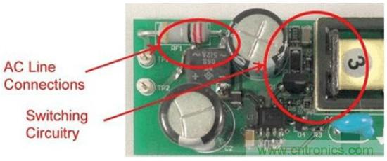 圖1是這些非計劃中電容的一個實例。圖中的右側(cè)是一個垂直安裝的FET,所帶的開關(guān)節(jié)點與鉗位電路延伸至了圖片的頂部。輸入連接從左側(cè)進入,到達距漏極連接1cm以內(nèi)的位置。這就是故障點,在這里FET的開關(guān)電壓波形可以繞過EMI濾波器耦合至輸入。