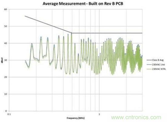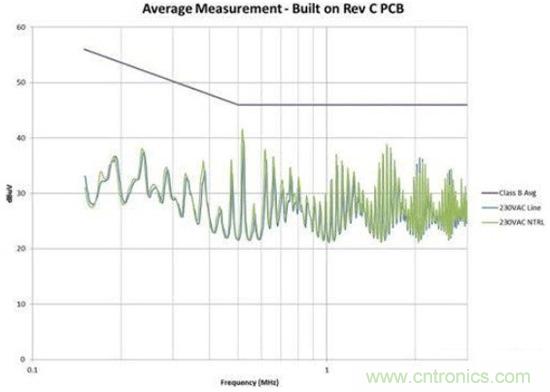 圖4是修改后的效果圖。我們在故障點位置為EMI規(guī)范獲得了大約6dB的裕量。此外,我們還顯著減少了總體EMI簽名。所有這些改善都僅僅是因為布局的調(diào)整,并未改變電路。如果您的電路具有高電壓開關(guān)并使用了屏蔽距離,您需要非常小心地對其進行控制。