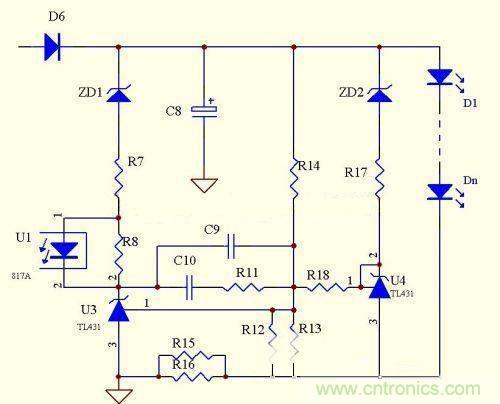 優(yōu)點(diǎn):電路簡單,元器件少,成本低,跟上面電路相比,顯著降低了取樣電阻的功耗,恒流精度很高,克服了上面的電路不能空載的致命缺陷,當(dāng)有個別LED擊穿時,可以自動調(diào)整輸出電壓。