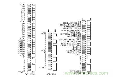 從圖4可見:89C51與MAX1647通信的開始條件是SDA端口為下降沿,同時SCL端口為高電平;MAX1647的 WRITE-WORD協(xié)議為0b00010010(0b表示二進制),或者可表示為0x12(0x表示十六進制);READ-WORD協(xié)議則可表示為 0b00010011或者0x13。另外,CMD0~CMD7代表具體的命令,D0~D15表示數(shù)據(jù)位。幾個常用的WRITE-WORD協(xié)議命令:ChargerMode()命令,命令代碼為0x12,主要用于清零和復位;ChargingVolage()命令,命令代碼為0x15,主要用于電壓預置;ChargingCurrent()命令,主要用于電流預置,命令代碼為0x14,即CMD7~CMD0的數(shù)據(jù)為00010100,16位二進制數(shù)值由D15~D0組成表示Io的電流值,單位為mA。當端子SEL與AGND短接時,電流Io的最大預置值為1.023A;如果讓端子SEL懸空,則 Io的最大預置值為2.047A;當端子SEL與VL短接,則Io的最大預置值為4.095A。MAX1647提供兩個電流源給負載供電:一個來自內(nèi)部的線性電流源IOUT,一個是開關(guān)電路提供的電流。IOUT提供1mA~31mA的電流(步長為1mA)。例如,當Io最大預置值為4.095A時,數(shù)據(jù)位 D11~D6對應為6位電流預置DAC的DA5~DA0位;數(shù)據(jù)位D4~D0對應輸出電流IOUT的I4~I0,表示IOUT線性電流源二進調(diào)整數(shù)。注意任何時候DAC位被置位,線性電流源被調(diào)整至滿幅(31mA)。AlarmWarning()命令,命令代碼為0x16,主要用于保護設(shè)置;ChargerStatus()命令,命令代碼為0x13,主要用于返回溫度傳感器以及MAX1647的內(nèi)部信息,這些信息暫存D15~D0位中。