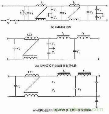 開關(guān)電源對內(nèi)、外的干擾及抗干擾中,共模信號與開關(guān)器件的工作方式、散熱器的安裝及整機(jī)PCB板與機(jī)殼的連接有相當(dāng)復(fù)雜的關(guān)系,共模信號在一定的條件下又可轉(zhuǎn)變成差模信號。其中解決共模干擾除了上述一般的EMI濾波電路,還可按如下電路圖的思想在電路上改進(jìn),使開關(guān)電源能夠在電路上改進(jìn)從而提高性能。圖1(b)為共模/差模干擾濾波器典型電路,圖1(c)為在圖1(b)基礎(chǔ)上變異的共模/差模干擾濾波電路。