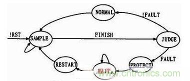 為了提高系統(tǒng)的可讀性以及代碼效率,軟件采用狀態(tài)機(jī)思想設(shè)計(jì),圖5所示為系統(tǒng)的狀態(tài)轉(zhuǎn)換圖。系統(tǒng)上電復(fù)位后進(jìn)入SAMPLE采樣狀態(tài),若檢測到采樣完成標(biāo)志FINISH則進(jìn)入JUDGE狀態(tài)進(jìn)行判斷,如果FAULT不為0即有故障信號(過壓/欠壓、過載、短路),則進(jìn)入PROTECT狀態(tài)關(guān)閉輸出,并跳轉(zhuǎn)到WAIT狀態(tài)等待故障信號消除。當(dāng)故障信號消除后,系統(tǒng)軟重啟,開始新的采樣及檢測。JUDGE狀態(tài)后如果未檢測到故障信號,則進(jìn)入NORMAL正常狀態(tài),進(jìn)行電壓調(diào)整。