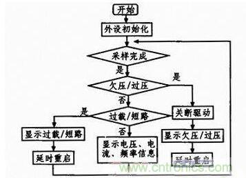 系統(tǒng)上電后,首先完成各個(gè)外設(shè)的初始化,主要包括系統(tǒng)時(shí)鐘、定時(shí)器、GPIO口、ADC、DMA、中斷及SPI的初始化。在此,定時(shí)器和中斷一旦初始化完成,PWM及SPWM波就會(huì)生成??紤]到過流、短路保護(hù)及反饋穩(wěn)壓的實(shí)時(shí)性要求較高,故在中斷內(nèi)完成。欠壓、過壓對實(shí)時(shí)性要求低,放在主程序內(nèi)。為提升系統(tǒng)的性能,ADC采樣使用DMA方式傳輸數(shù)據(jù),傳輸完成后,發(fā)出中斷申請,對采集到的數(shù)據(jù)進(jìn)行簡單濾波處理,其他功能函數(shù)調(diào)用此數(shù)據(jù)完成相應(yīng)的保護(hù)及穩(wěn)壓功能。主程序的流程圖如圖6所示。
