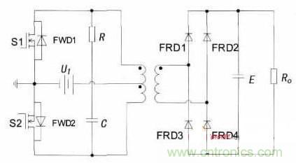 當S1開通時,其漏源電壓uDS1只是一個開關(guān)管的導(dǎo)通壓降,在理想情況下可假定uDS1=0,而此時由于在繞組中會產(chǎn)生一個感應(yīng)電壓,并且根據(jù)變壓器初級繞組的同名端關(guān)系,該感應(yīng)電壓也會疊加到關(guān)斷的S2上,從而使S2在關(guān)斷時承受的電壓是輸入電壓與感應(yīng)電壓之和約為2UI.在實際中,變壓器的漏感會產(chǎn)生很大的尖峰電壓加在S2兩端,從而引起大的關(guān)斷損耗,變換器的效率因受變壓器漏感的限制,不是很高。在S1和S2的漏極之間接上RC緩沖電路,也稱為吸收電路,用來抑制尖峰電壓的產(chǎn)生。并且為了給能量回饋提供反饋回路,在S1和S2兩端都反并聯(lián)上續(xù)流二極管FWD.