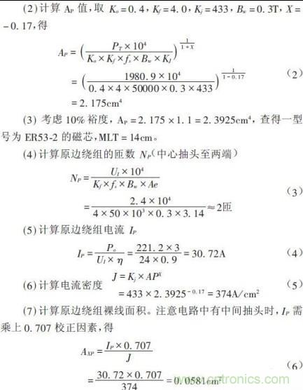 采用面積乘積(AP)法進行設(shè)計。對于推挽逆變工作開關(guān)電源,原邊供電電壓UI=24V,副邊為全橋整流電路,期望輸出電壓UO=220V,輸出電流IO=3A,開關(guān)頻率fs=25kHz,初定變壓器效率η=0.9,工作磁通密度Bw=0.3T.