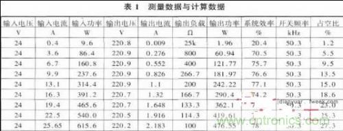 實驗結(jié)果表面,輸出電壓穩(wěn)定在220V,紋波電壓較小。最大輸出功率能達到近600W,系統(tǒng)效率基本穩(wěn)定在80%,達到預(yù)期效果。如下表1所示。