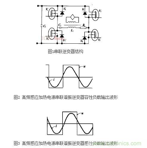 作為高頻感應加熱電源設備的重要組成部分,串聯(lián)諧振逆變器在工作中具有損耗低、工作適應性良好等優(yōu)勢。這種逆變器在實際應用中也被稱為電壓型逆變器,其基礎(chǔ)結(jié)構(gòu)的原理圖如圖1所示。在實際工作的過程中,串聯(lián)諧振型逆變器的輸出電壓為近似方波。由于電路工作在諧振頻率附近,使振蕩電路對于基波具有最小阻抗,所以負載電流ia近似正弦波。同時,為避免逆變器上、下橋臂間的直通,換流必須遵循先關(guān)斷后導通的原則,在關(guān)斷與導通間必須留有足夠的死區(qū)時間。下圖中的圖2和圖3分別示出容性負載和感性負載的輸出波形。