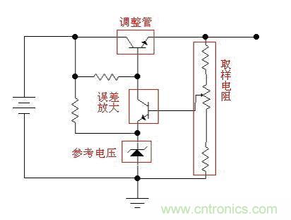 讓我們繼續(xù):如果我們用一個(gè)三極管或者場(chǎng)效應(yīng)管,來(lái)代替圖中的可變阻器,并通過(guò)檢測(cè)輸出電壓的大小,來(lái)控制這個(gè)“變阻器”阻值的大小,使輸出電壓保持恒定,這樣我們就實(shí)現(xiàn)了穩(wěn)壓的目的。這個(gè)三極管或者場(chǎng)效應(yīng)管是用來(lái)調(diào)整電壓輸出大小的,所以叫做調(diào)整管。