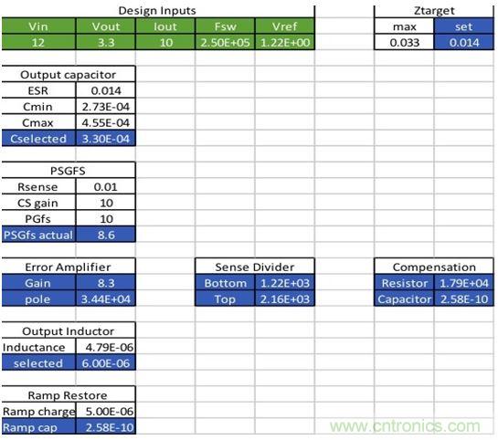 最小電容和最大電容限值也是計(jì)算出來的,而最終入選值還可供選擇,選定值再用于剩下的計(jì)算。這些覆蓋值也允許其它輸入,包括PGFS和輸出電感。重要的是,這些決定和選擇要按此順序進(jìn)行。